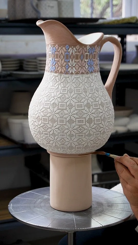Este proyecto nació de un desafío artístico. El juego de jarra de agua con seis vasos que ves aquí fue diseñado por la maestra artesana Eva Servín Morales específicamente para participar en un certamen de artesanías. Su creación, que une la fuerza de nuestra pasta cerámica con la delicadeza visual de un bordado, recibió tanto cariño y admiración en redes sociales que decidimos honrar ese diseño.
