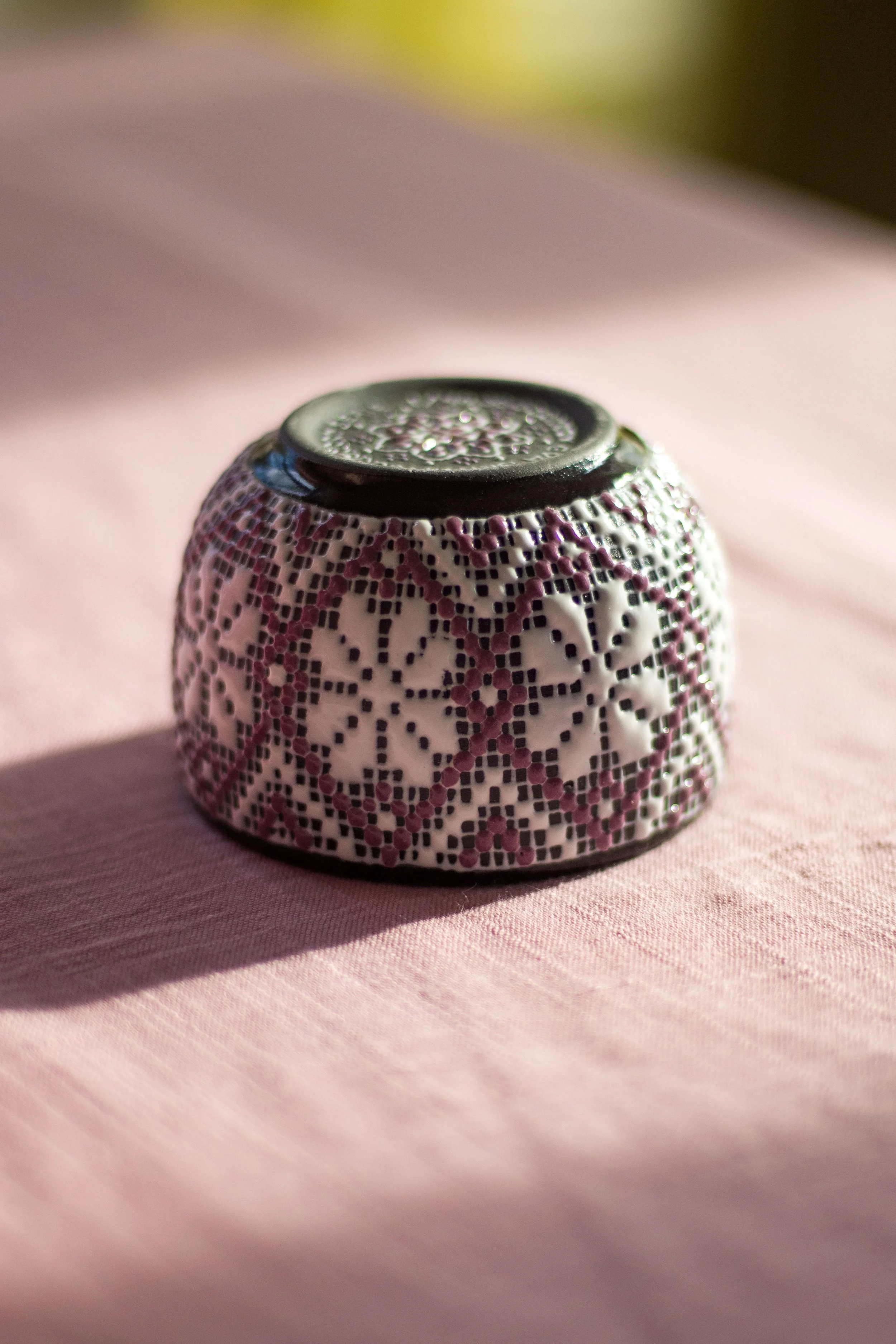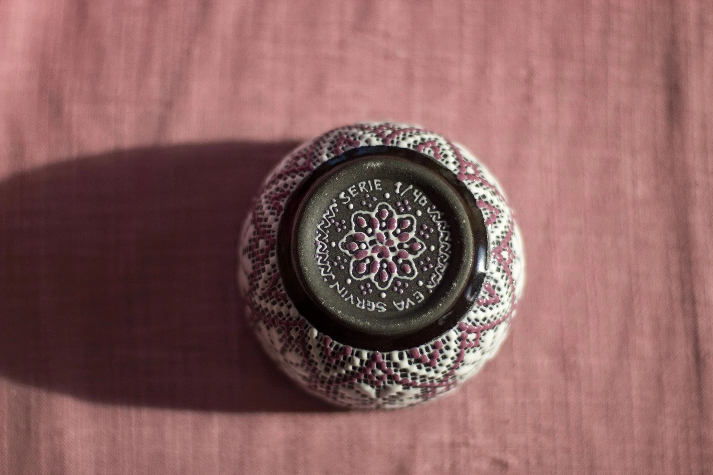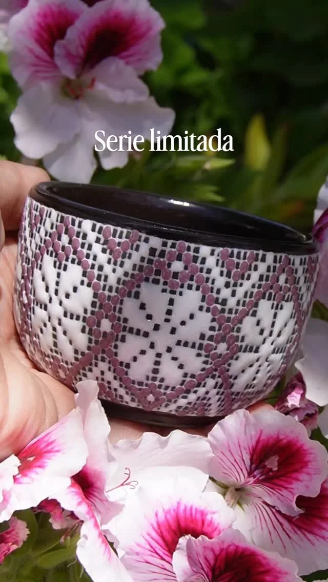 Vaciado en una pasta cerámica negra de alta temperatura, su cuerpo oscuro y elegante sirve como el lienzo perfecto para un decorado minucioso en tonos blanco y morado. La pieza destaca por su técnica de "Cerámica Hilada", donde flores tejidas a mano brotan de la superficie, creando un contraste único entre la firmeza mineral y la calidez textil.