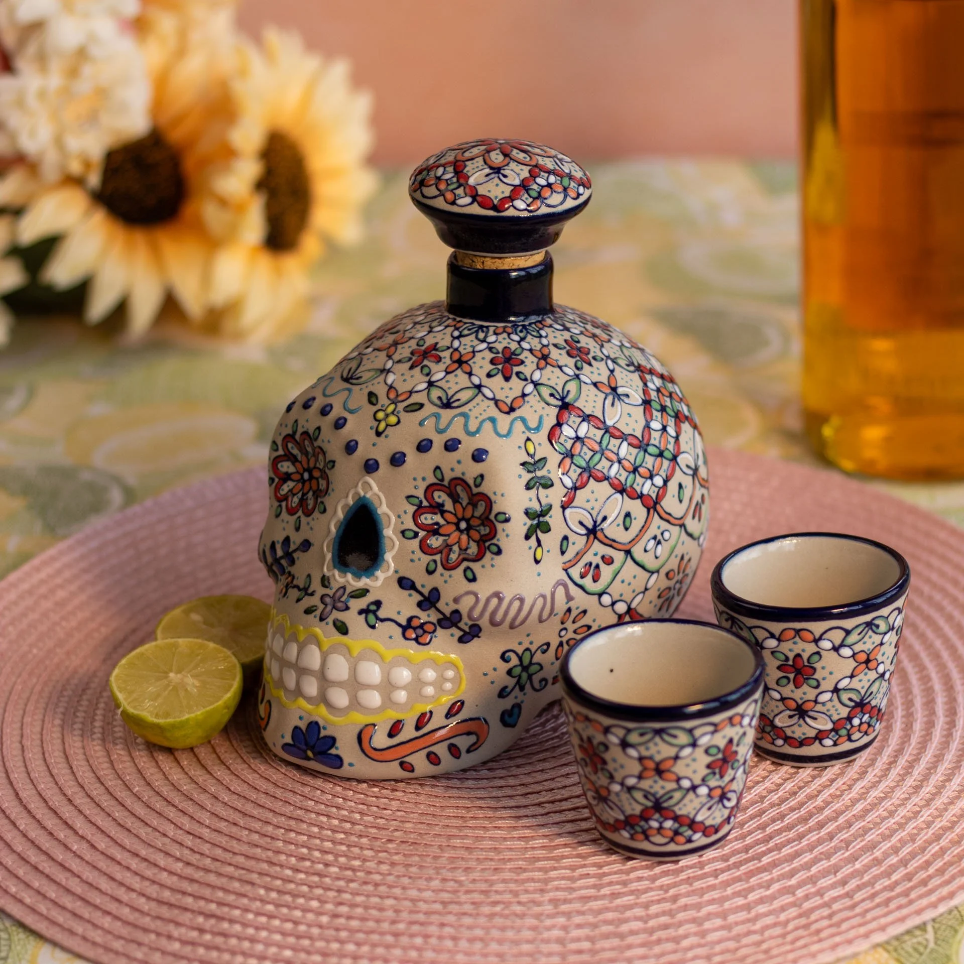 Licorera de cerámica en forma de calavera esmaltada por dentro para mantener frescas tus bebidas favoritas en todo momento. Además, se complementa con dos caballitos mezcaleros.